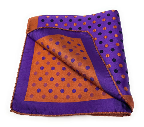 Crafted from luxurious Italian silk woven in Como, this handmade pocket square combines sophistication and versatility. The purple and orange jacquard weave creates depth and character, making it a perfect accessory for both formal and creative looks. Each piece is hand rolled with care by Italian artisans.